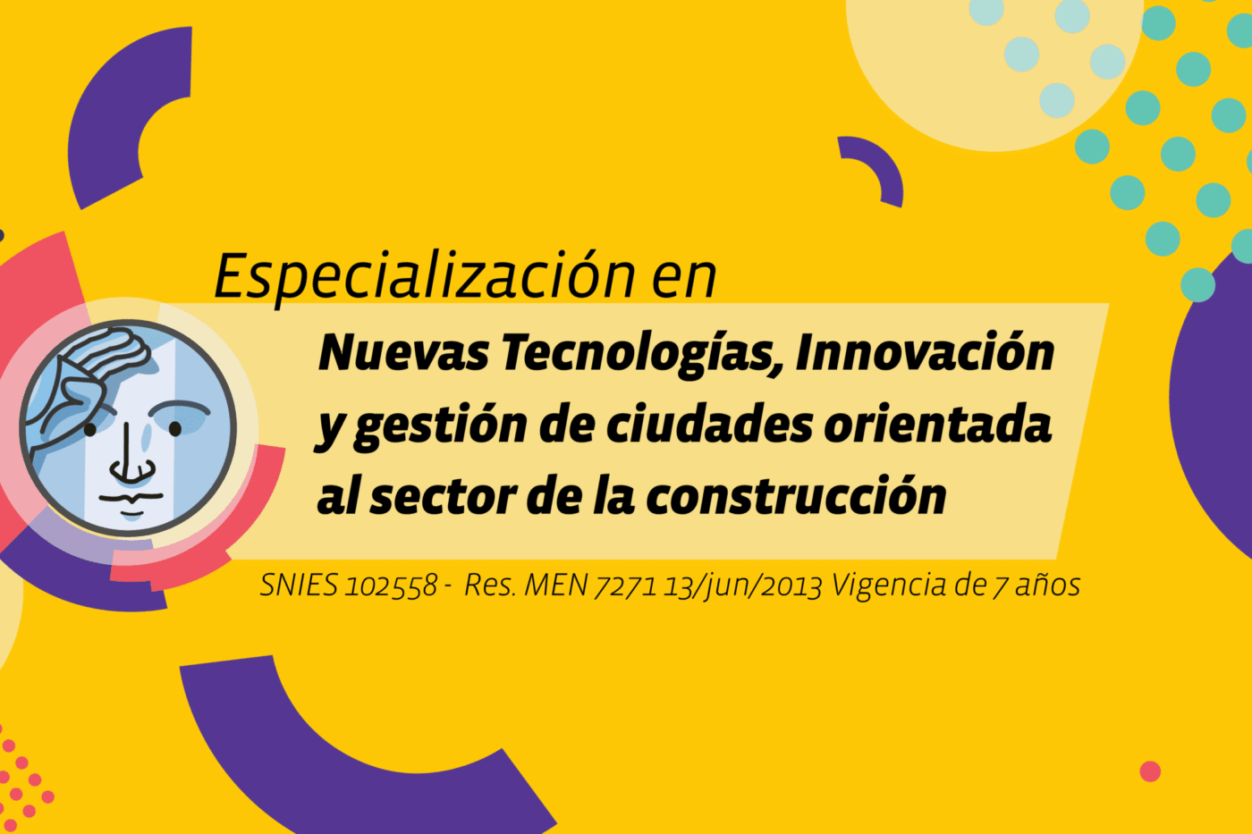La Especialización en Nuevas Tecnologías, Innovación y Gestión de Ciudades, orientada al Sector de la Construcción, tiene como objetivo principal el desarrollo de competencias para planeación y gestión de territorios –municipios, distritos, áreas metropolitanas, departamentos y regiones– más ordenados, habitables, innovadores, competitivos, integrados y sostenibles, a partir del diseño y desarrollo de políticas, modelos de negocio, programas, estrategias, proyectos y servicios de gobierno digital, promoción de comunidades y ciudades inteligentes, y desarrollo de infraestructuras y edificios inteligentes.